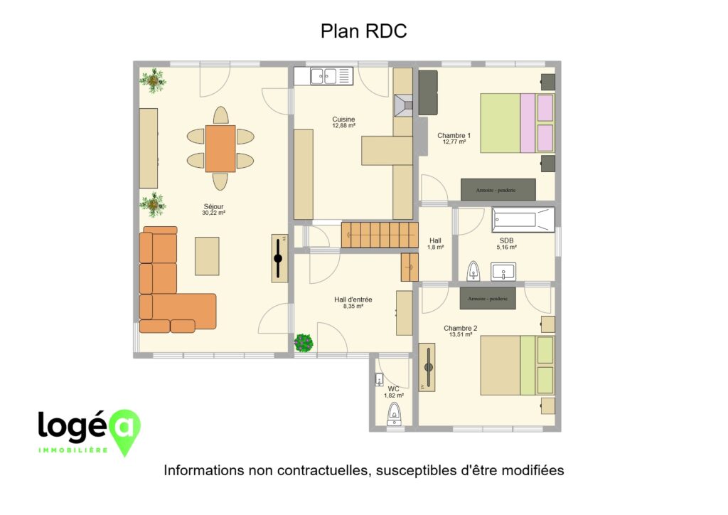 Rez-de-chaussée : hall d’entrée, WC séparé, salle à manger, salon, cuisine, terrasse et jardin ;