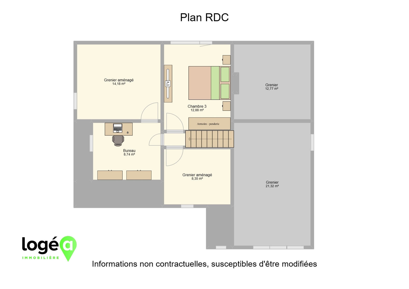 Au 1er étage : Une chambre, un bureau et 2 pièces de grenier aménagées.