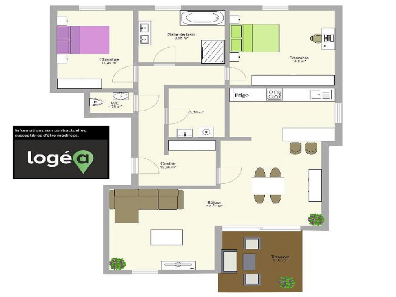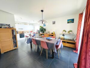 Composition : hall d’entrée, séjour avec cuisine équipée (43 m²), terrasse, hall de nuit, W.C, buanderie 2 chambres (11 & 15 m²), salle de bain (8 m²).